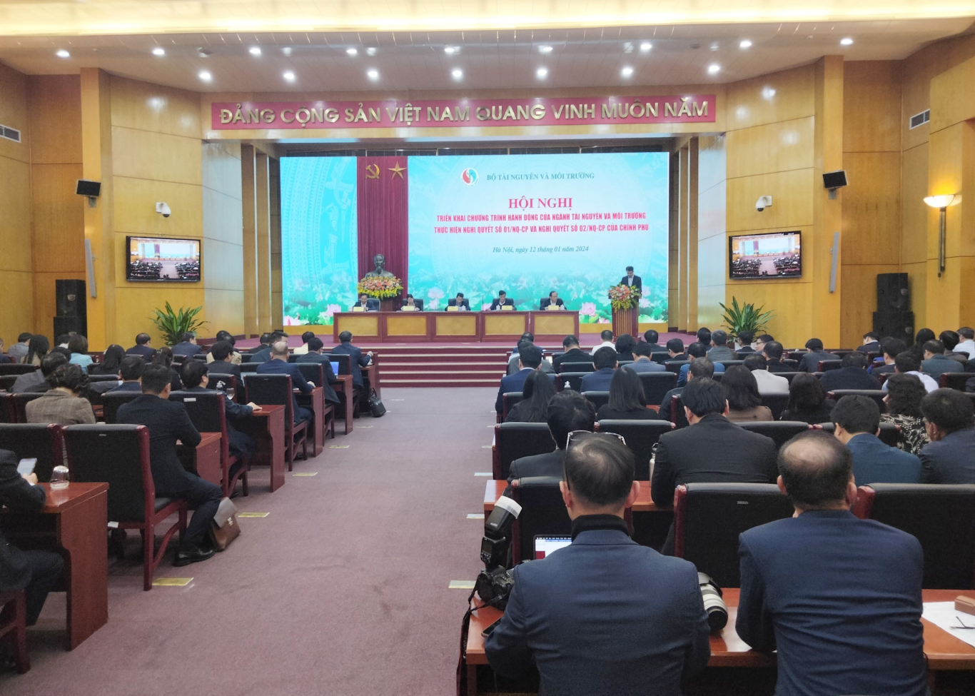 Ngày 12/1/2024, tại Hà Nội, Bộ TN&MT tổ chức Hội nghị Triển khai Chương trình hành động của ngành TN&MT thực hiện Nghị quyết số 01/NQ-CP và Nghị quyết số 02/NQ-CP của Chính phủ. Bộ trưởng Đặng Quốc Khánh cùng các Thứ trưởng: Nguyễn Thị Phương Hoa; Trần Quý Kiên; Lê Công Thành; Lê Minh Ngân đồng chủ trì Hội nghị. Tham dự Hội nghị có ông Bùi Huy Thành, Phó Vụ trưởng vụ V – Ban Tổ chức Trung ương; bà Phạm Thị Thu Thuỷ, Phó Vụ trưởng Vụ theo dõi công tác phòng chống tham nhũng, tiêu cực – Ban Nội chính Trung ương; nguyên Thứ trưởng Bộ TN&MT Võ Tuấn Nhân; đại diện lãnh đạo các đơn vị, tổ chức, đoàn thể trực thuộc Bộ…